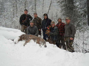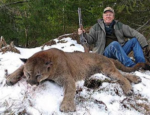 Having rain and wet conditions make it near impossible for the dogs to stay on the scent of a cougar track. With snow and cool temperatures locating a track is made easy, as well, optimal conditions allow us to differentiate between large males and females and provide a good indication on the age of a cougar track. Once road access has ended and the cougar track enters heavy cover the hounds are released and begin trailing the cat until treed. The actual trailing can vary from a short 5 minute "pop up" to an all day marathon. Once the cat is treed every effort will be made to get as close as possible to the area by accessing one of the many logging roads that wind their way through our area. The final push to the tree will be made on foot in a variety of terrain. We can tailor your Vancouver Island cougar hunt to your physical condition.